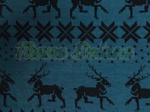 Norweskie wzory z reniferami na głębokim turkusowym kolorze. Dzianina jest dosyć gruba (pomimo 200 g/m2), miła w dotyku, naturalnie pracuje. Idealnie nada się na zimowe swetry, narzutki, sukienki, a nawet czapki czy szaliki