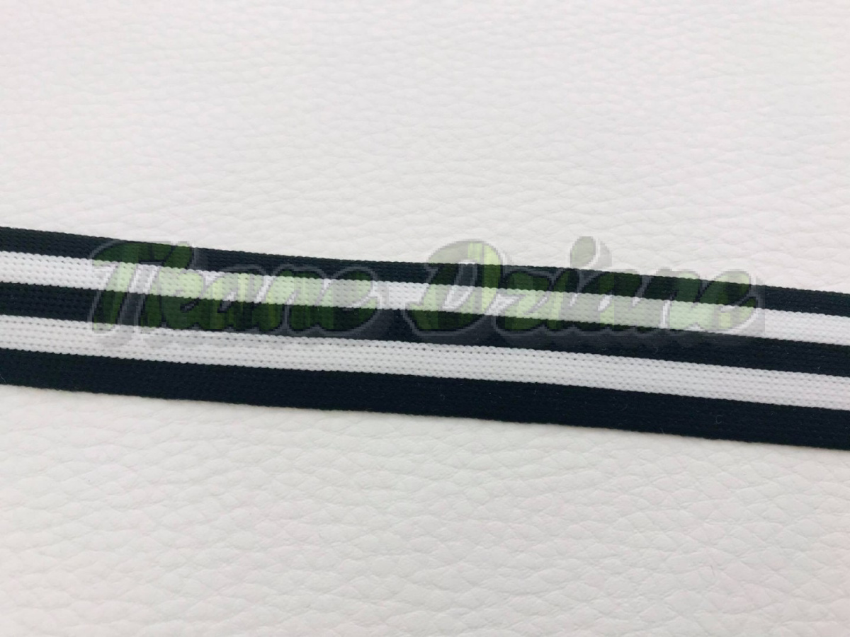 Taśma lampasowa elastyczna o szerokości 25mm w kolorach czarno-białym. Zastosowanie: element dekoracyjny lub maskujący odzieży do naszycia na nogawki spodni, rękawów itp....