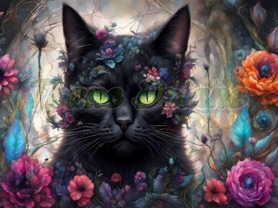 PANEL DRUKOWANY POZIOMY NA PODUSZKI CZARNY KOT W KWIATACH NR 2