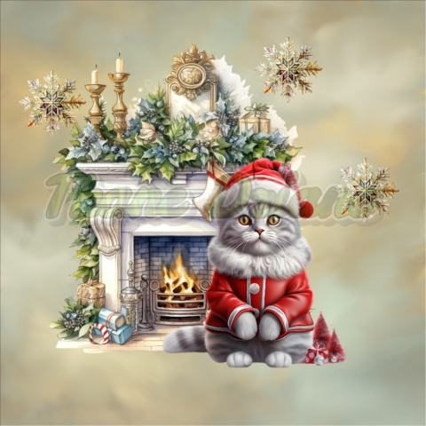 PANEL DRUKOWANY SZARY W UBRANKU MIKOŁAJA PRZED KOMINKIEM ŚWIĄTECZNE KOTY TŁO ZŁ NR 14