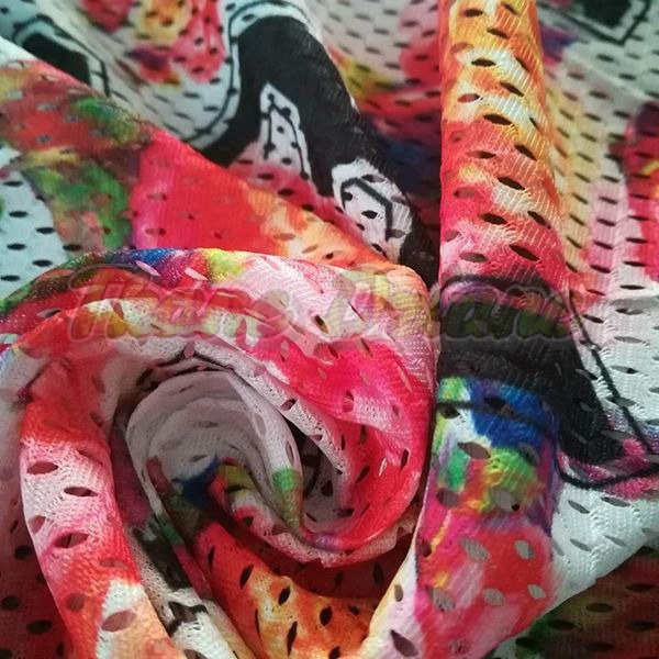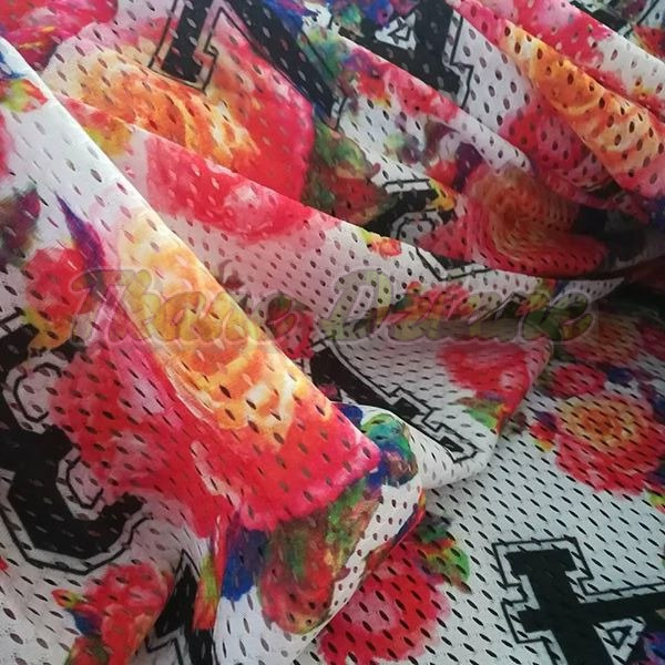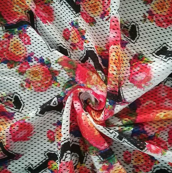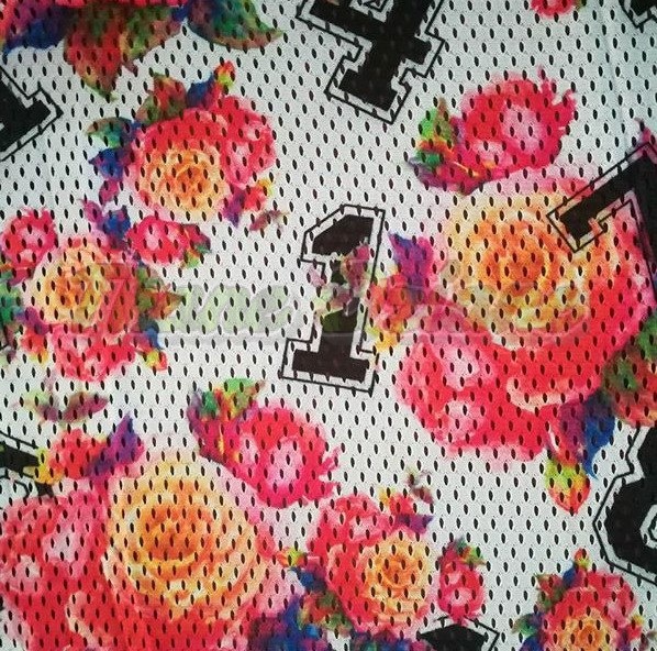 Siatka w róże i cyferki z czerwono-pomarańczowym kolorem kwiatów. Nadaje się na letnie topy, bluzki, sukienki czy letnie kurteczki chroniące przed słońcem, a także odzież sportową. Może być również wykorzystana do plecaków, worków, kosmetyczek. Szerokość 167 cm i gramatura 215g/m2