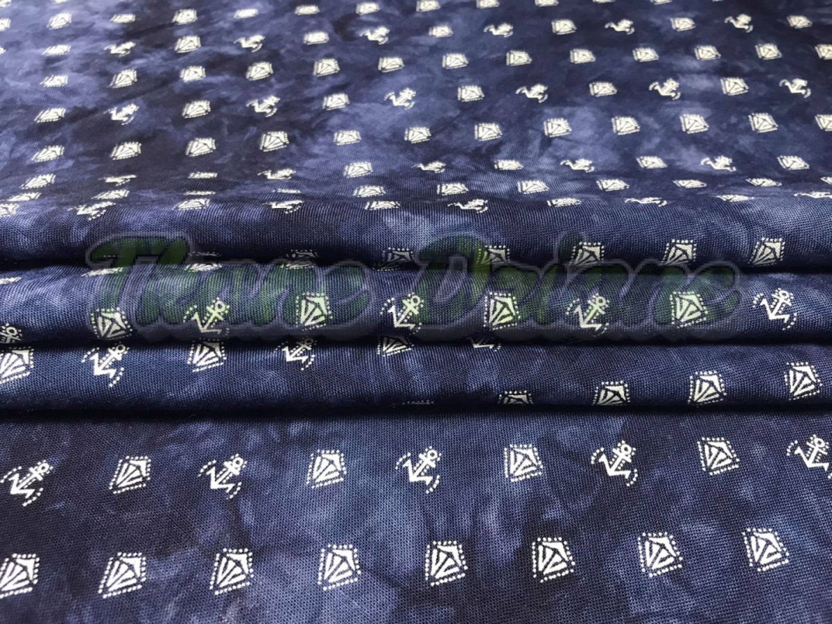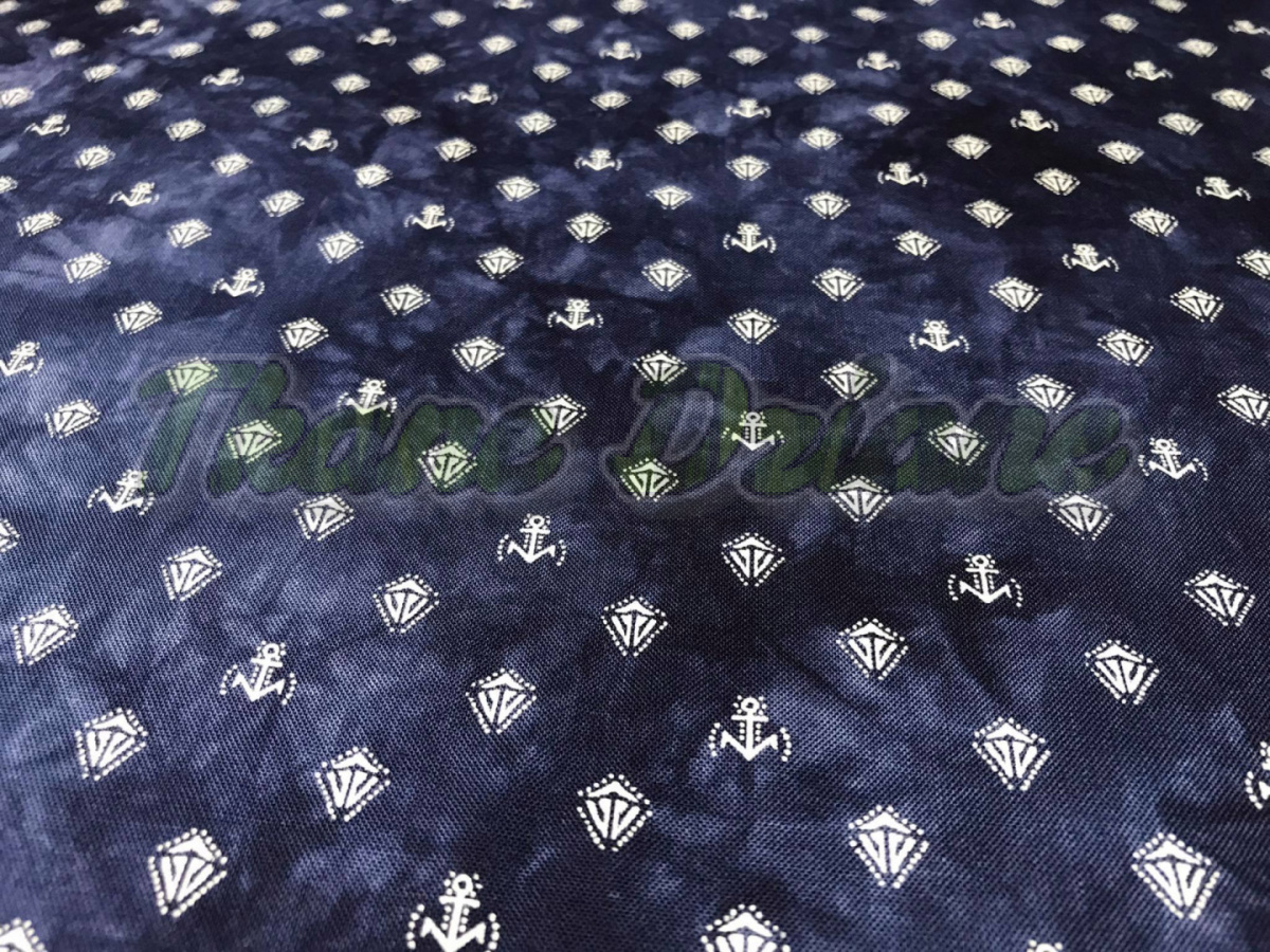 Tkanina wiskozowa we wzór malutkich (ok. 1 cm) kotwic na granacie . Idealnie nadaje się na sukienki, spódniczki, koszule...