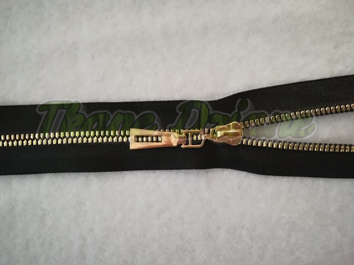 Zamek metalowy, ozdobny, złoty na czarnej taśmie, kostkowy #5, długość 80 cm.